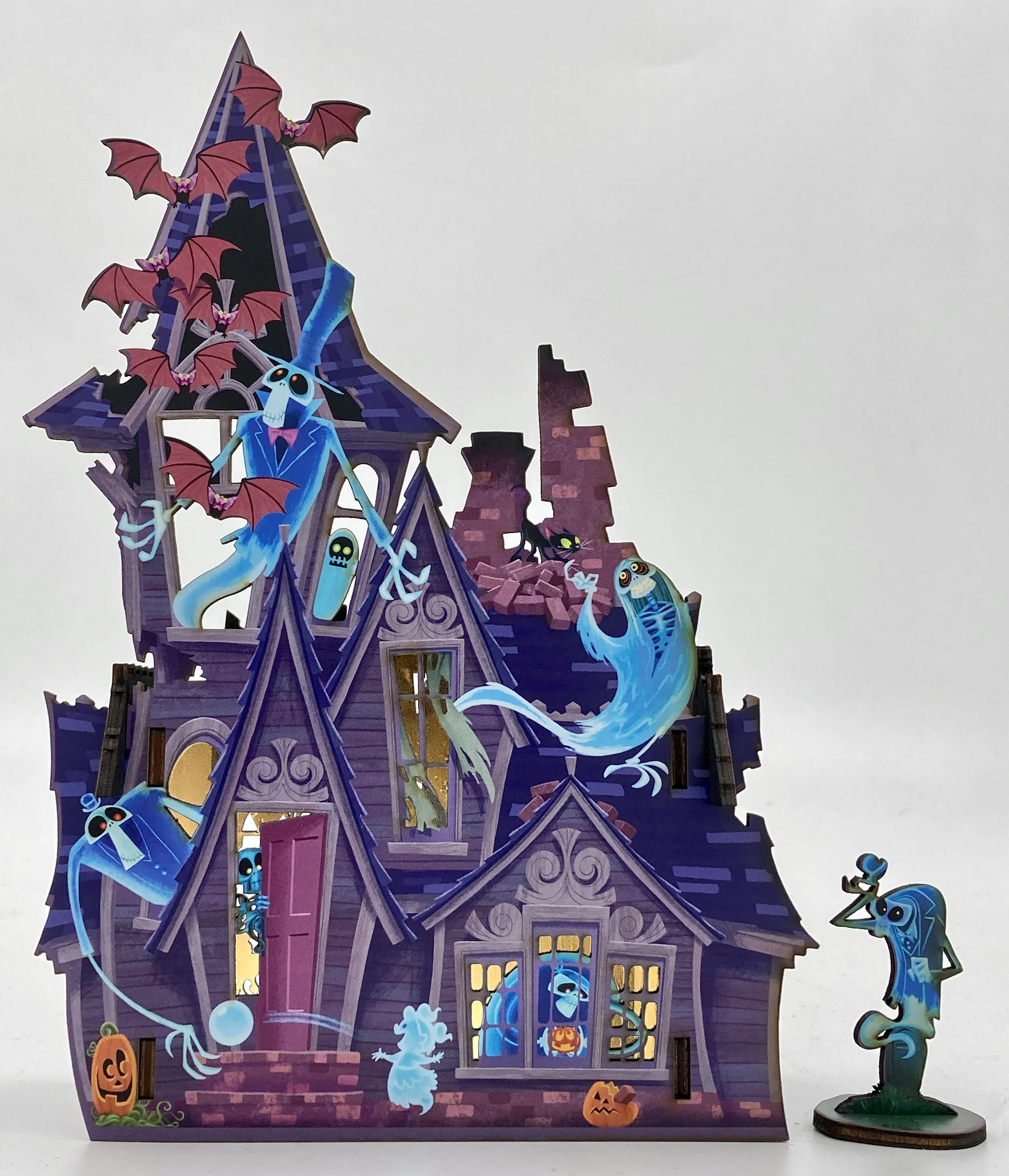 Swazzle Puppet Studio and artist Eric Scales have teamed up to bring you something spooky this Halloween: a wooden Tabletop Haunted House Kit! All four sides of this deathly domicile are jam packed with ghosts, skeletons, and jack-o’lanterns. This professionally printed, laser cut display is approx. 10 inches tall, 7 inches wide and 3 1/4 inches deep.